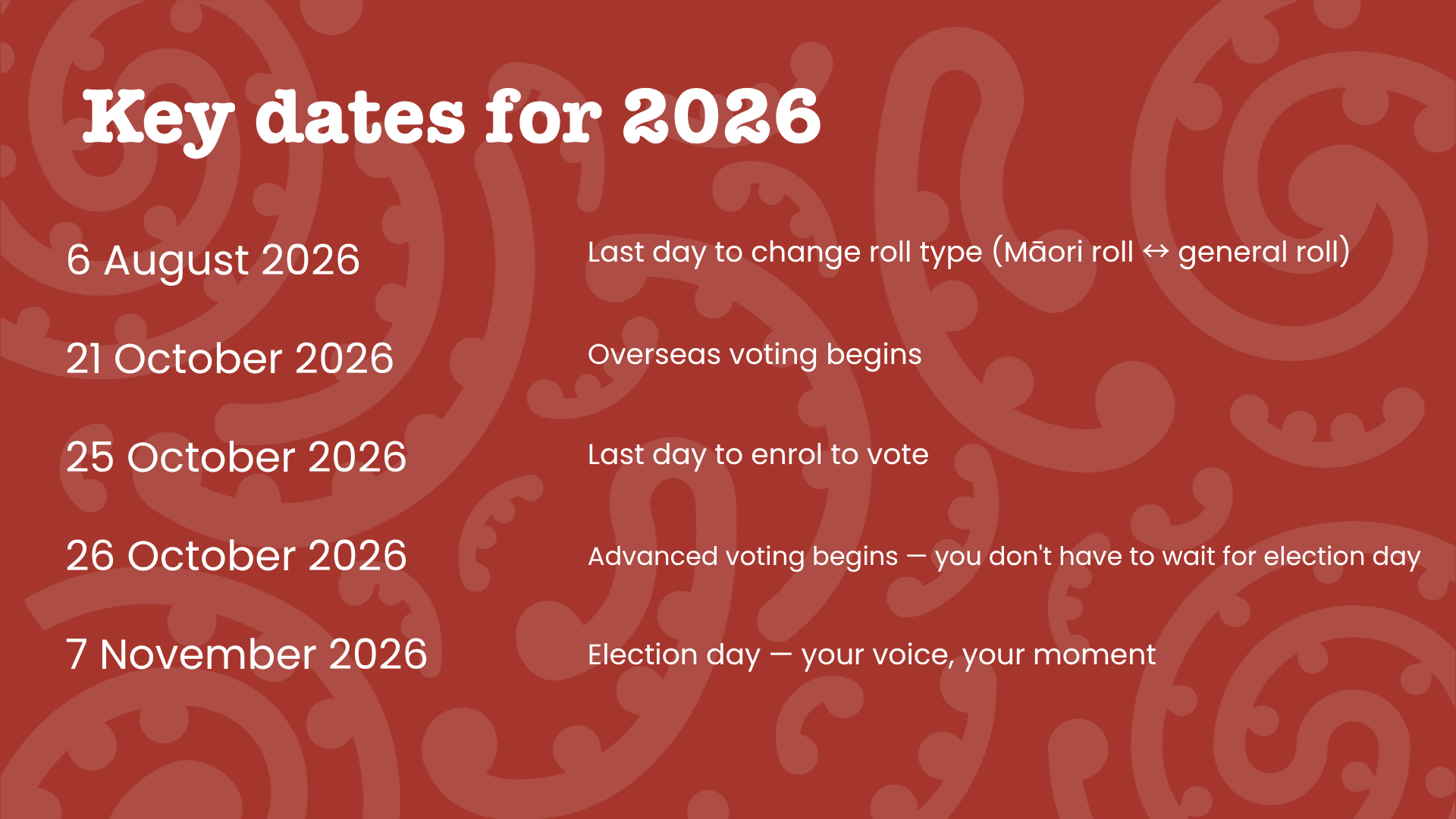 For the 2026 general election, the last day to enrol is 25 October 2026 — but don't wait. Enrol now while you're thinking about it.