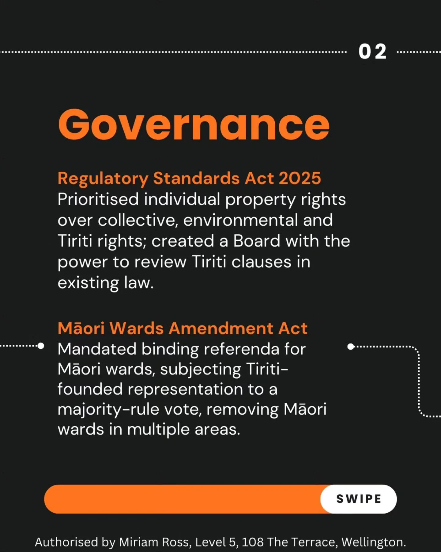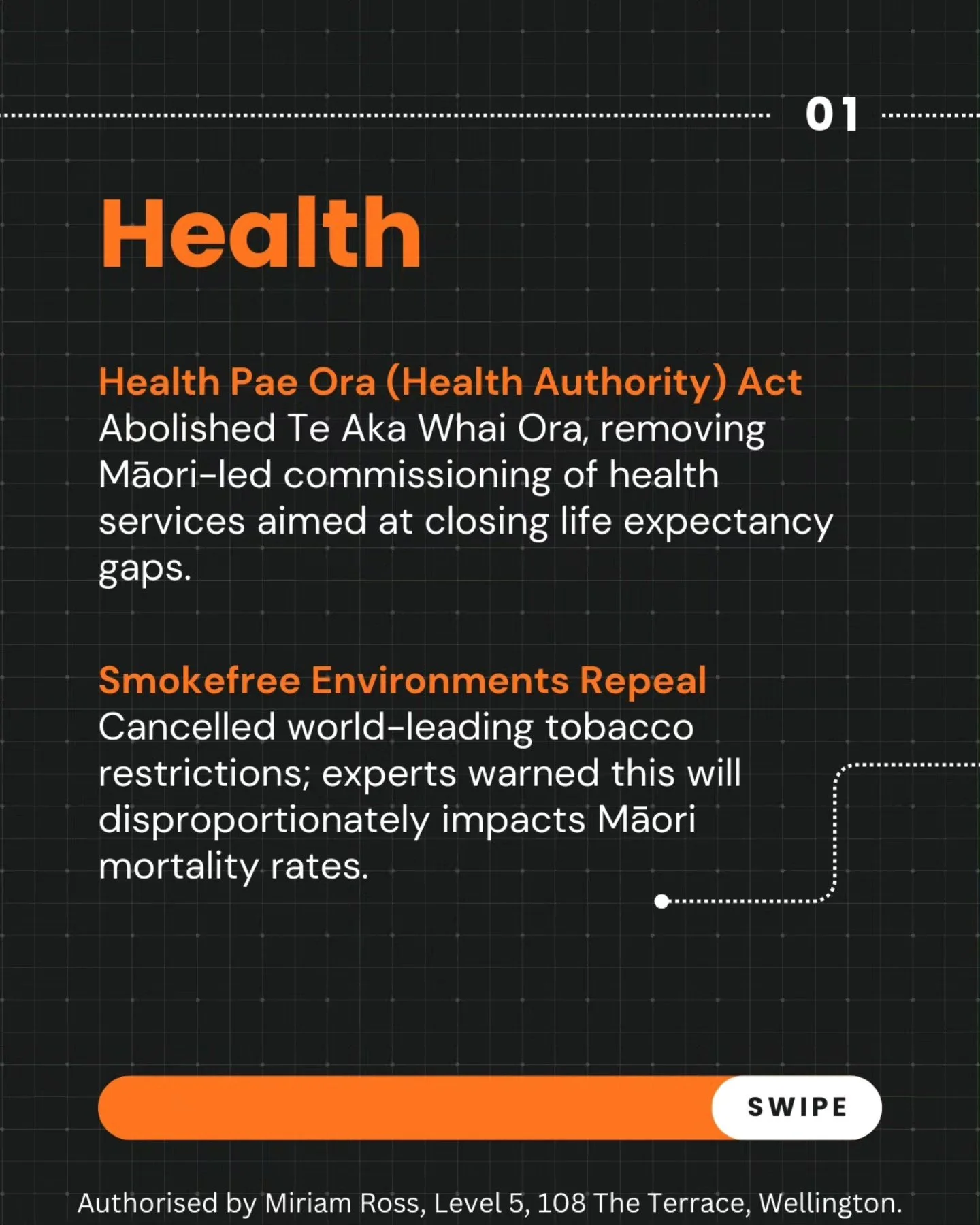 The images abovr are not exhaustive. They are a snapshot. A reminder that policy does not sit in isolation — it shapes our health systems, our whenua, our language, our tamariki, and our representation in governance.